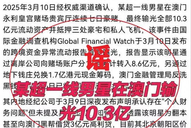 爆料称某超一线男星在澳门永利皇宫豪赌七日,输光10.3亿流动资产,还抵押了三处豪宅和私人飞机。